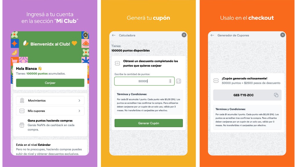 Por ejemplo: si realizás una compra de $10.000, obtenés 10.000 puntos, equivalentes a $500 en descuentos para usar en futuras compras. Los puntos se canjean generando cupones directamente desde tu cuenta.